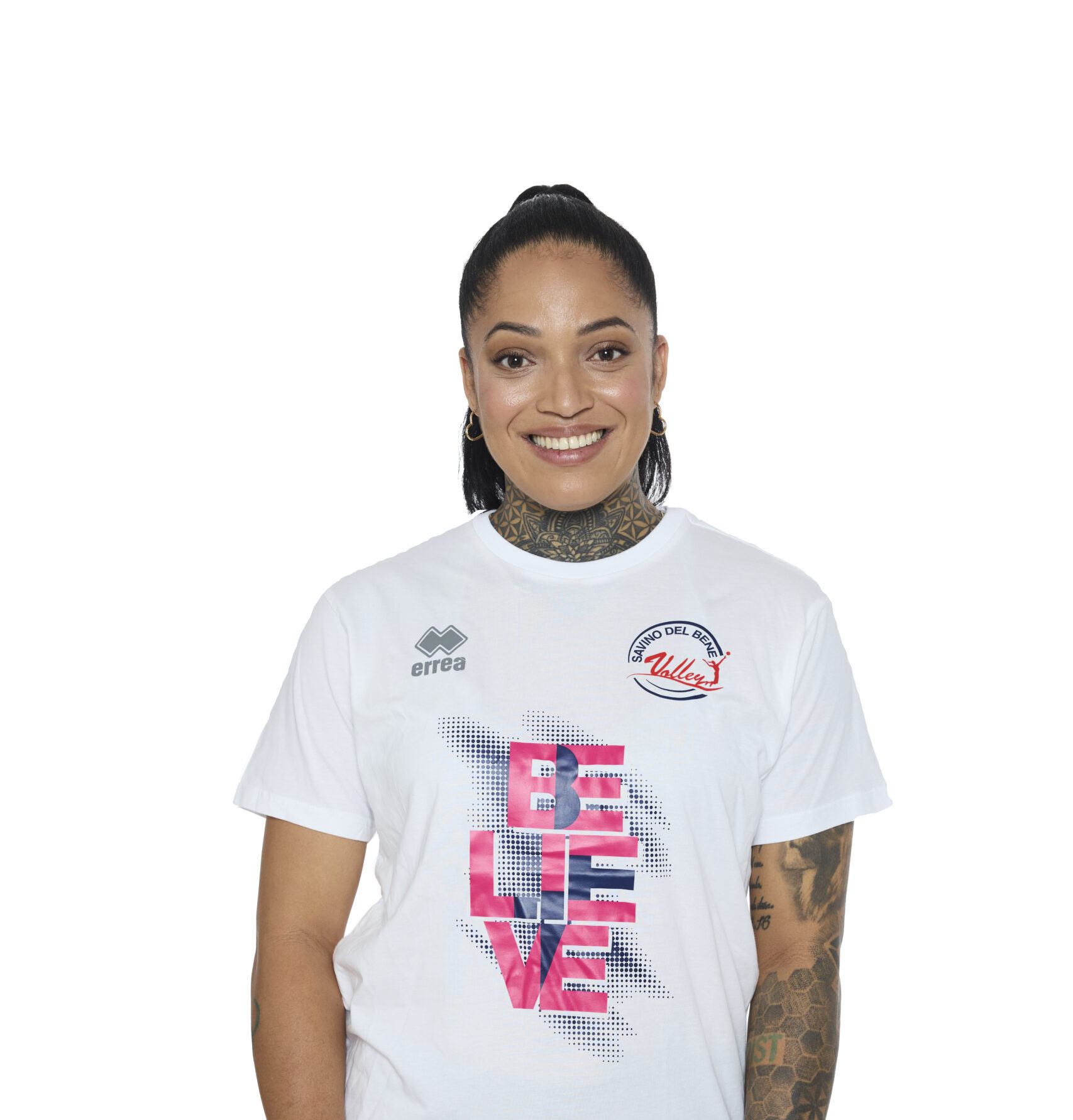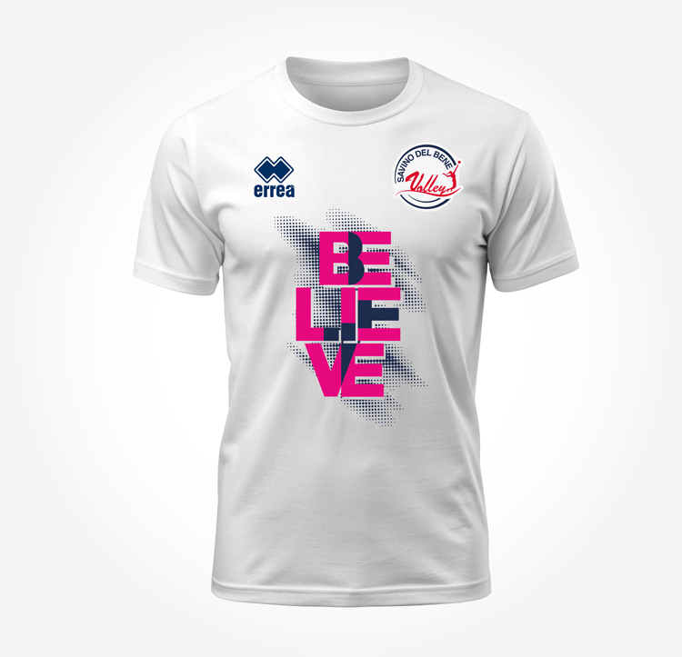 T-shirt manica corta in cotone con motto BELIEVE stampato sul petto e logo Savino Del Bene Volley sullo sfondo.